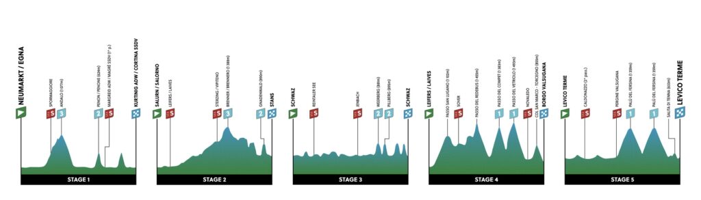 Martedì 16 aprile, il TotA ripartirà dall’Alto Adige per la frazione più lunga, 189,1 Km da Salorno a Stans, in Tirolo. Dopo la terza tappa di 127 Km, interamente tirolese con partenza e arrivo a Schwaz, giovedì 18 aprile la carovana tornerà in Alto Adige per ripartire da Laives e la frazione regina con arrivo a Borgo Valsugana, in Trentino, dopo 141,3 Km e poco meno di 4000 metri di dislivello. Il Tour of the Alps si concluderà venerdì 19 aprile con una frazione interamente trentina di 118,6 Km con partenza e arrivo a Levico Terme.