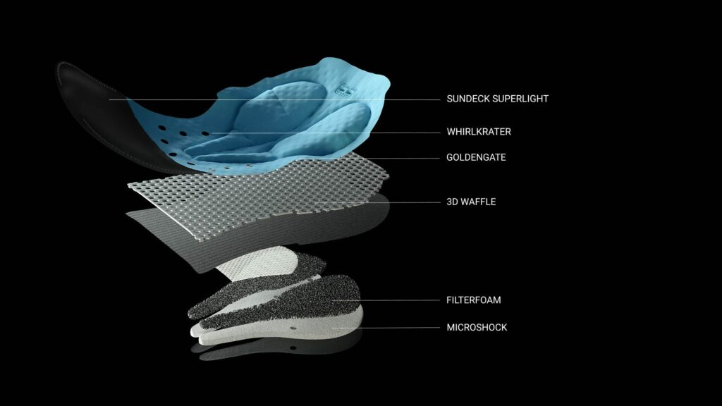Infine a diretto contatto con il tessuto sottostante c’è la schiuma MicroShock, anche questa altamente ammortizzante, con densità differente da quella soprastante. Il risultato è una triplice sovrapposizione che assicura comfort in tutte le situazioni e lo fa in combinazione con la tecnologia – anche questa brevettata e collaudata – con cui Assos fissa i fondelli ai suoi pantaloncini: la famosa GoldenGate, che lasciando delle porzioni perimetrali scucite tra fondello e tessuto permette al primo di seguire sempre il profilo del corpo a prescindere dallo stile di pedalata di quel momento e/o dall’intensità.