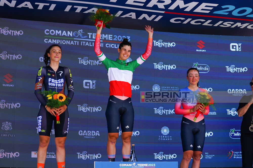 Campionati Nazionali Italia Donne 2023-U23 2023 – Crono Individuale – Sarche – Sarche 25,7km – 22/06/2023 – Carlotta Cipressi (UAE Development Team) – Cristina Tonetti (Top Girls – Fassa Bortolo) – Federica Damiana Piergiovanni (UAE Development Team) – foto Massimo Fulgen