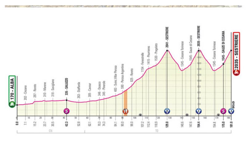 Di conseguenza, Mauro Vegni ha spiegato: la tappa prevede la partenza da Alba e la tripla scalata al Sestriere, la prima volta da Pragelato e le altre due da Cesana. La tappa avrà circa 4500 metri di dislivello, ma è normale che la cancellazione del Colle dell’Agnello non permette di vivere una tappa come l’avevamo pensata in precedenza. A questo punto immagino che quella di domani, sullo Stelvio, possa diventare la tappa che possa decidere la maglia rosa di Milano”.