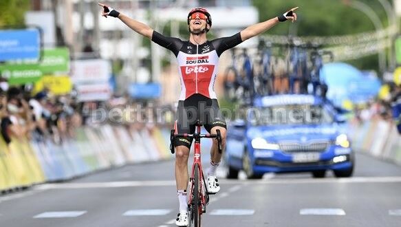 Il belga della Lotto-Soudal va in fuga e sorprende il gruppo dei velocisti nella frazione di apertura del Criterium du Dauphiné (Issoire-Issoire, 182 km). Secondo posto per Sonny Colbrelli, vincitore della volata generale.