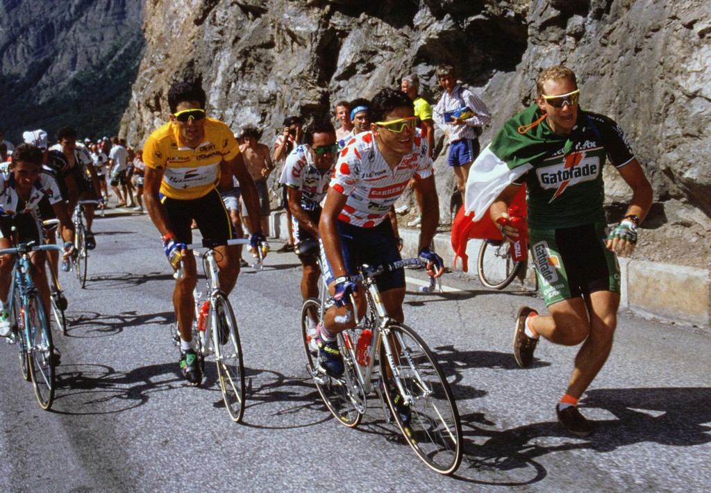 Poi il passaggio alla Carrera di Davide Boifava, era uno dei tanti: tanto per capirci, quando si facevano le foto di squadra, lui era in ultima fila e non gli facevano neanche le cartoline. Lui passava da casa mia e ci accordavamo per stampare un po’ di foto per lui e i pochi fan che aveva. Poi dal 1990 è cambiato tutto. Nella prima tappa del Tour, Chiappucci entra in una fuga definita “bidone” che poi entrerà nella storia del 77° Tour de France. Rimane in maglia gialla fino alle porte di Parigi, dove viene superato dal favorito Greg Lemond. Da quel giorno però “Il Diablo” diventa l’attaccante numero 1 del ciclismo mondiale. Foto e cartoline se ne trovano a valanghe, entra nelle foto di squadra nella prima linea e diventa capitano della Carrera. Andiamo ai Mondiali in Giappone, siamo molto legati, abbiamo fatto anche delle vacanze con le nostre famiglie e chiaramente c’è un legame particolare. Un giorno, durante l’allenamento, ci fermiamo sul percorso e prendiamo una bandiera dei Mondiali come ricordo, ce ne sono tantissime e copiamo un po’ quello che fanno in molti.