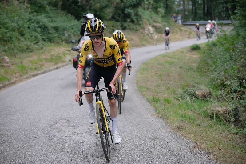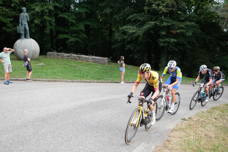 La corsa, a questo punto, è diventata magnifica. Dopo alcuni tentativi, all’inizio della seconda scalata del Monte di Ragogna in testa si sono portati Van Bekkum e Raffaele Mosca (Q36.5). Quindi alla coppia di testa si è aggregato Graat e, dopo pochi km, anche Ryan. Mosca non ha retto il ritmo imposto dal trio della Jumbo-Visma e si è staccato.