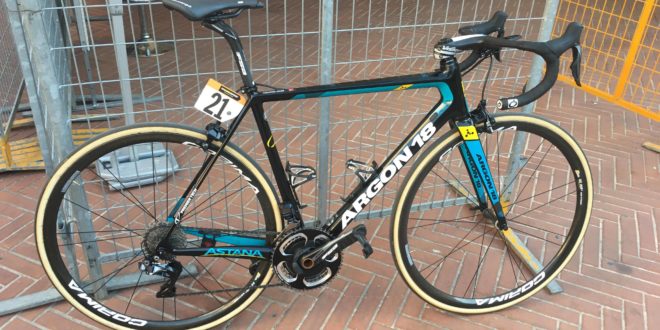 Jakob Fuglsang ha utilizzato un rapporto molto particolare per ottenere la bellissima vittoria nella tappa di Recanati. I due muri da affrontare non erano per niente semplici, nemmeno per un professionista, in quanto la pendenza media era superiore al 10% e le punte massime toccate sono state del 19%. Da diversi anni, l’Astana ha un legame molto forte con l’azienda canadese Argon 18: le biciclette fornite vengono completate con gruppo Shimano, pedivella FSA, sella Prologo e ruote Corima.