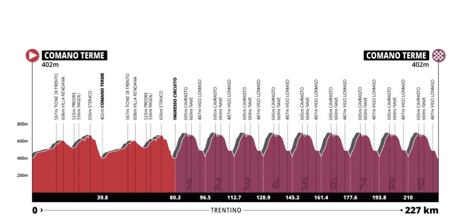 Le due prove si decideranno sul medesimo circuito finale di 16 km, che da Comano Terme si snoda verso Fiavè e la salita di Cavrasto (5,6 km al 5,2). Le donne lo ripeteranno in quattro occasioni per un dislivello complessivo della prova di 2.480 metri, mentre gli uomini percorreranno nove giri dell’anello finale per un dislivello complessivo di 3.730 metri.