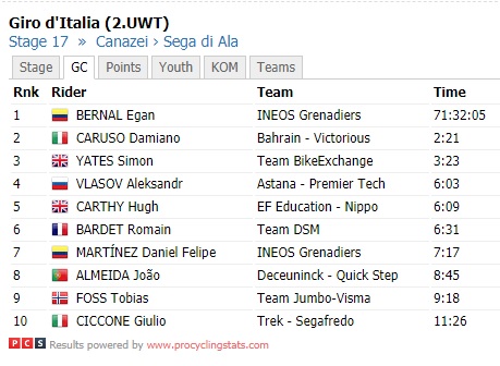 Almeida e Yates procedono insieme, mentre Bernal verrà raggiunto da Damiano Caruso prima e da Diego Ulissi poco dopo. Daniel Martin vincerà la tappa, Almeida si classifica secondo staccando Yates all’ultimo chilometro ed entrambi guadagnano circa un minuto su Egan Bernal, che resta in Maglia Rosa ma avvertendo qualche scricchiolio.