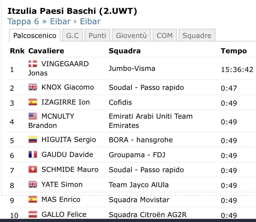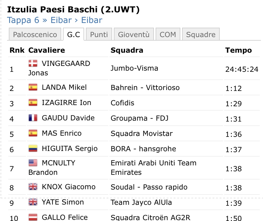 Il danese con il passare dei chilometri ha incrementato il suo margine fino ad oltre un minuto, mentre gli inseguitori si sono raggruppati, lottando per la seconda piazza. Arrivo in solitaria per Vingegaard, mentre alle sue spalle James Knox (Soudal-QuickStep) è riuscito ad anticipare il drappello con Ion Izagirre (Cofidis) terzo.