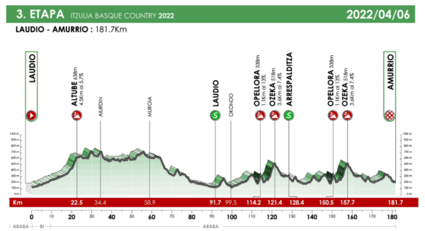 181,7 chilometri che comprendono tante insidie. Il primo dei cinque GPM della giornata arriva quasi subito, con Altube (3° categoria, 4500 metri al 5,7%). Poi si entra in un circuito assai frastagliato, che prevede le scalate di Opellora (3° categoria, 1100 metri al 13%) e Ozeka (2° categoria, 3600 metri al 7,4%) in rapida successione, una ‘doppietta’ da compiere due volte. L’ultimo GPM arriva a 24 chilometri dal traguardo, ma da lì non è per nulla finita, con tanti strappetti su cui chi ha scattato proverà a tenere il proprio margine.