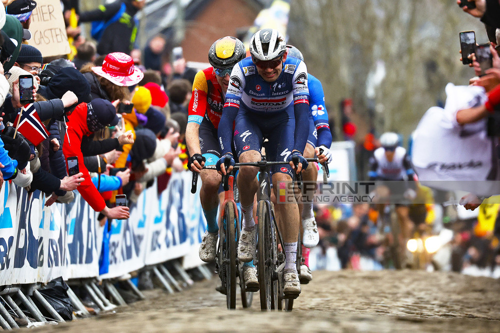 Difficile a livello tattico la situazione tra i big: l’unico che ha avuto il coraggio di cambiare la situazione è stato il solito Tadej Pogacar (UAE Emirates) che sulla penultima scalata dell’Oude Kwaremont ha staccato tutti, lanciandosi all’attacco. Successivamente lo sloveno ha preferito aspettare gli altri e si è andato a formare il terzetto di favoriti con Wout van Aert (Jumbo-Visma) e Mathieu Van der Poel (Alpecin-Deceuninck).