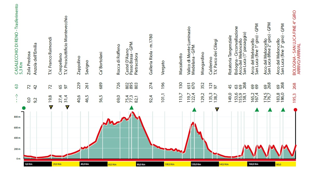 Primo tratto di corsa lineare, eccezion fatta per i due traguardi volanti racchiusi nei 35 km iniziali. Dal km 40 comincerà la lunga scalata verso il GPM del Passo Brasa (8,3km al 7%), a cui farà seguito l’inedito Valico di Monte Luminasio (7,3km al 9%). Dopo lo scollinamento mancheranno 73 km al traguardo, ma le difficoltà vere arrivano dal cartello dei 40 km all’arrivo. Qui i corridori transiteranno una prima volta sotto l’Arco del Meloncello che sancisce l’inizio dell’ascesa al Colle di San Luca (2,1km al 10% con punte del 18%), scalata da ripetere per ben cinque volte.