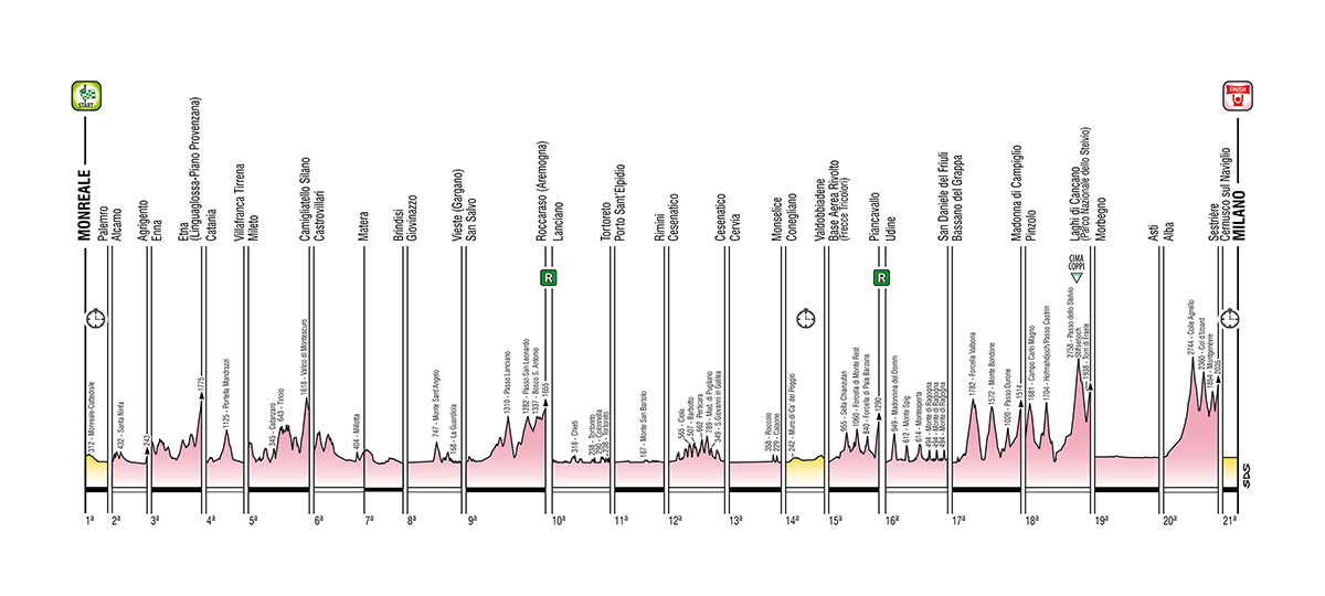 Senza dubbio, ciò che salta all’occhio è che ci sarà tanto Sud. Le prime 4 tappe avranno luogo in Sicilia: la grande partenza sarà a Monreale, con una cronometro di 15 km che porterà i corridori fino a Palermo. La prima salita vera sarà già alla terza tappa, con l’arrivo in quota sull’Etna.