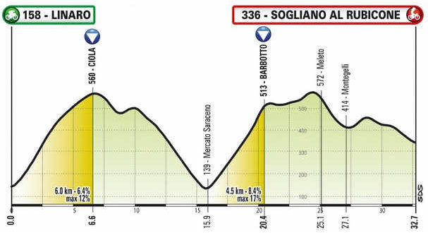 La seconda frazione del Giro interattivo parte da Linaro e termina a Sogliano al Rubicone dopo 32.7 chilometri e ben 980 metri di dislivello. Un antipasto di quella che sarà una delle frazioni più tecniche della prossima edizione della corsa che dovrebbe andare in scena ad ottobre: la Cesenatico-Cesenatico sul percorso della granfondo Nove Colli, 205 chilometri, nove salite e 3840 metri di dislivello.