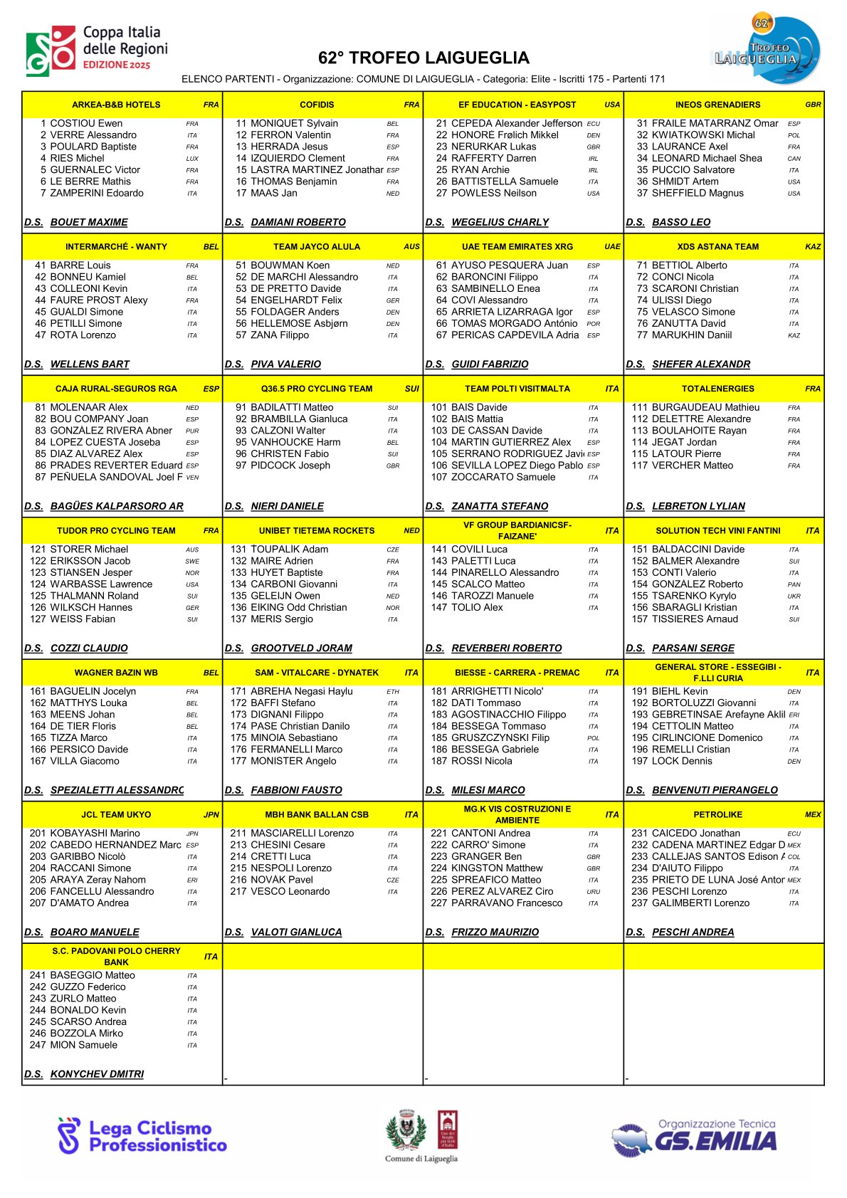 L’Italia risponde con il tricolore Alberto Bettiol (XDS Astana Team), trionfatore in un Giro delle Fiandre, e con un gruppo di corridori esperti e ambiziosi. I compagni di squadra di Bettiol includono Christian Scaroni, Diego Ulissi, otto volte vincitore di tappa al Giro d’Italia, Simone Velasco, campione italiano 2023 e già vincitore a Laigueglia nel 2019, e Lorenzo Rota (Intermarché-Wanty).