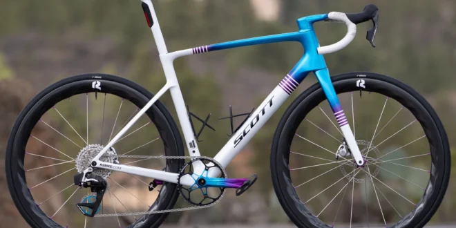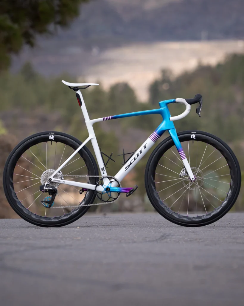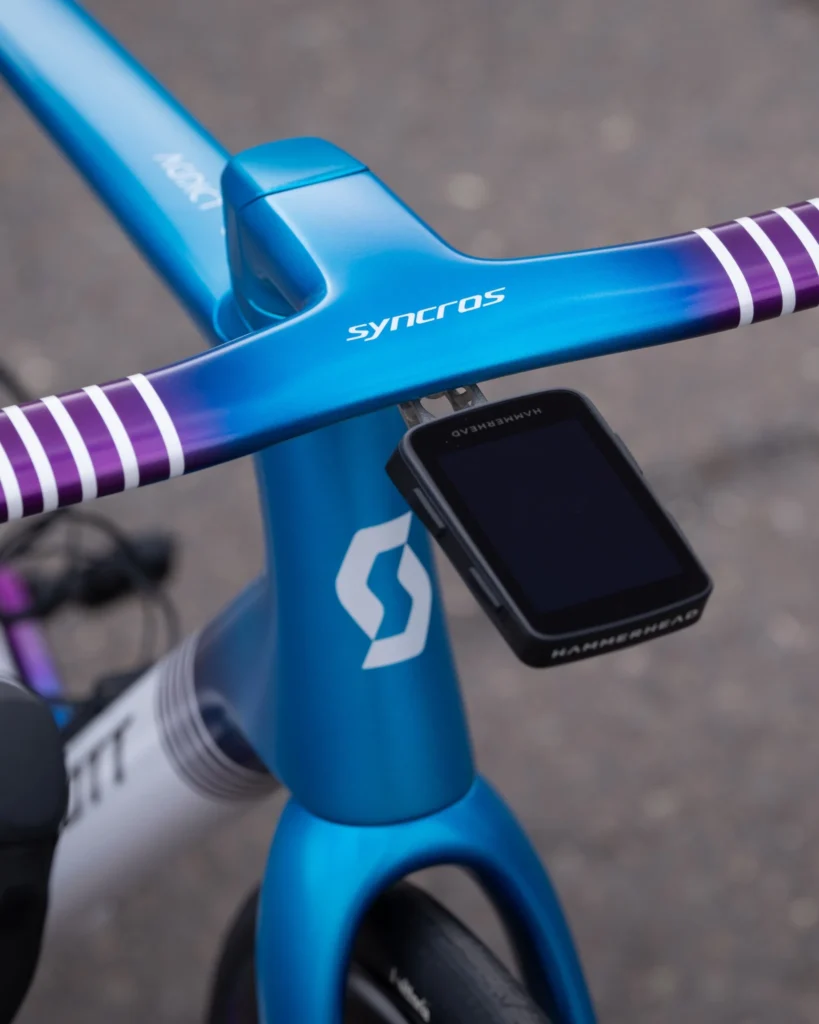 Il set di telai è il SCOTT Addict RC Pro, realizzato in carbonio HMX e disponibile nella taglia L/56 cm per il 2025. Gli assi passanti sono forniti da Syncros, così come il sistema di sterzo e l’espansore. Il manubrio, anch’esso di Syncros, è il modello IC-R100-SL, avvolto in nastro Fizik Vento Solocush, per un comfort ottimale durante le lunghe pedalate. Anche il supporto per il computer è un prodotto Syncros, il modello iC SL INSPIR3D.