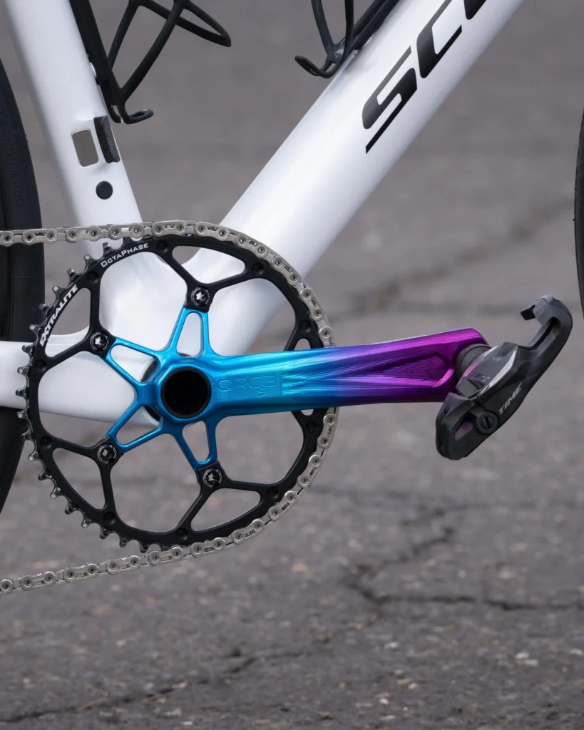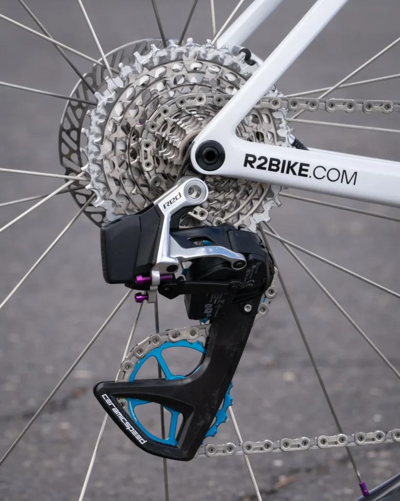 Il deragliatore posteriore e il gruppo pedivella sono anch’essi SRAM RED AXS, con un set di pedivelle Extralite QRC-3S da 170mm e corone Extralite OctaPhase. Le pedaliere sono Time XPRO 12SL, mentre la catena e il pacco pignoni sono SRAM RED 10-36T. Le ruote sono costruite da r2-bike, dotate di mozzi Extralite SPD3+, raggi Sapim e cerchi LB Turbo 50.