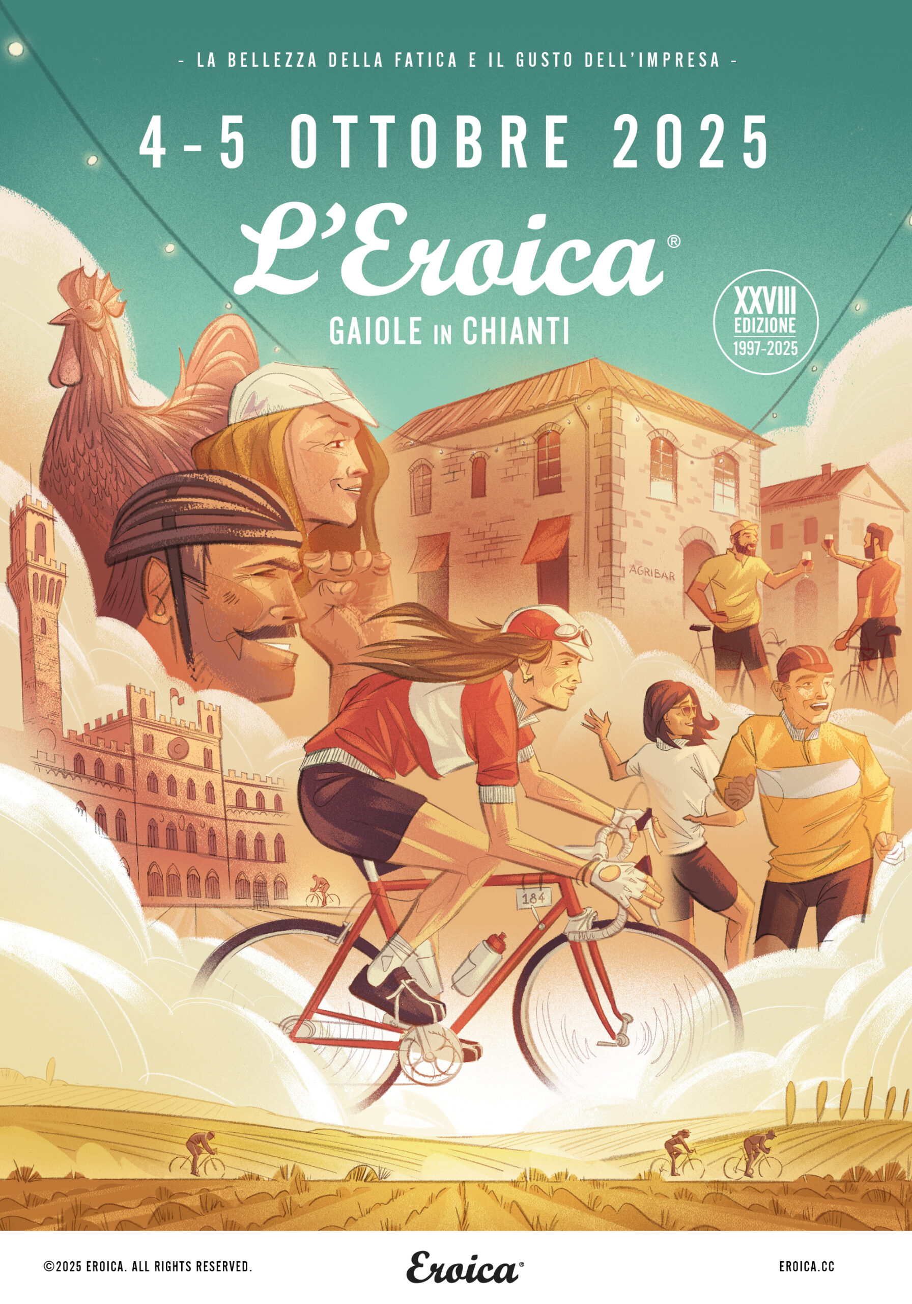 Il poster de L’Eroica 2025, creato da Giacomo Bettiol, celebra l’anima dell’evento, unendo ciclismo, cultura e paesaggi iconici del Chianti. I protagonisti del poster sono rappresentati come eroi di un racconto epico, immersi in un contesto che richiama il calore e l’accoglienza della Toscana, rinnovando la narrazione di un’impresa collettiva e senza tempo.