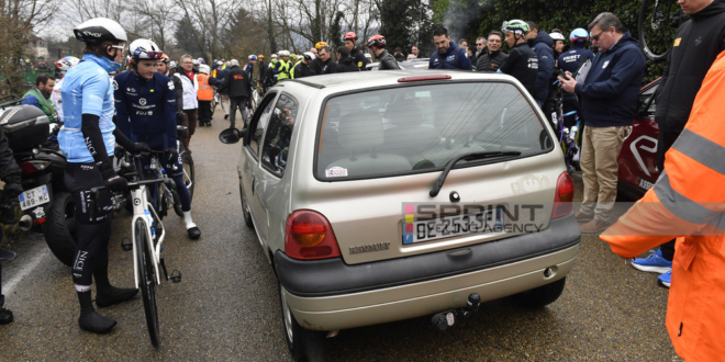 la situazione nella Ster di Bessèges è diventata sempre più tesa, con incidenti che hanno coinvolto il gruppo e auto sul percorso.