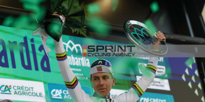 Un mese più tardi, l’11 ottobre 2025, arriva un’altra impresa: la quinta vittoria consecutiva di Pogačar al Giro di Lombardia. Sul Passo di Ganda scatta e non si volta più. Taglia il traguardo in solitudine, la maglia iridata che brilla sotto il sole lombardo. È storia pura: eguaglia Fausto Coppi nel record delle vittorie consecutive nella “classica delle foglie morte”.