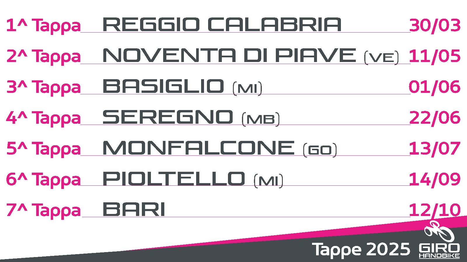 La partenza avverrà il 30 marzo dal Lungomare di Reggio Calabria, una novità assoluta per questa edizione. Il Giro Handbike abbraccerà l’Italia, attraversando la Calabria, il Veneto, la Lombardia e il Friuli, fino alla finalissima in Puglia, a Bari.