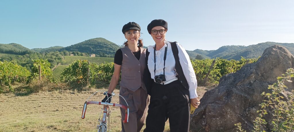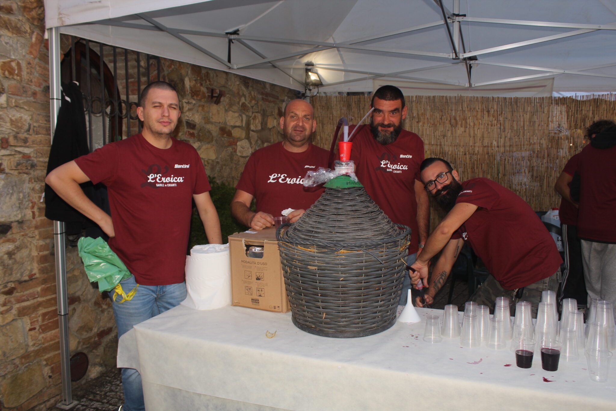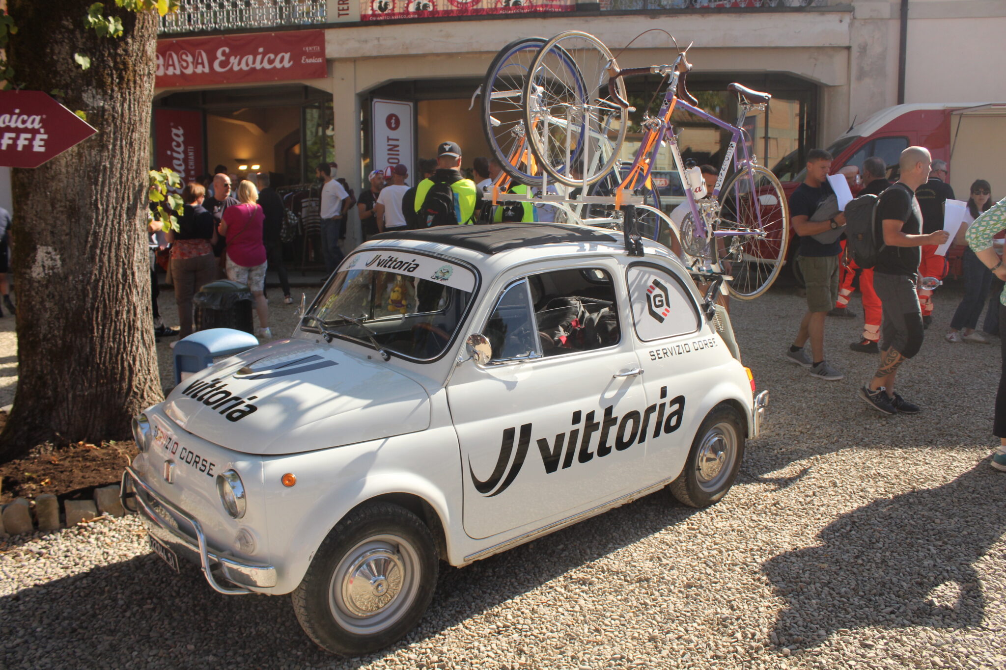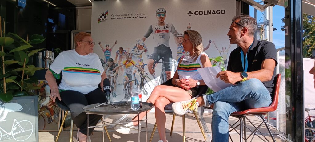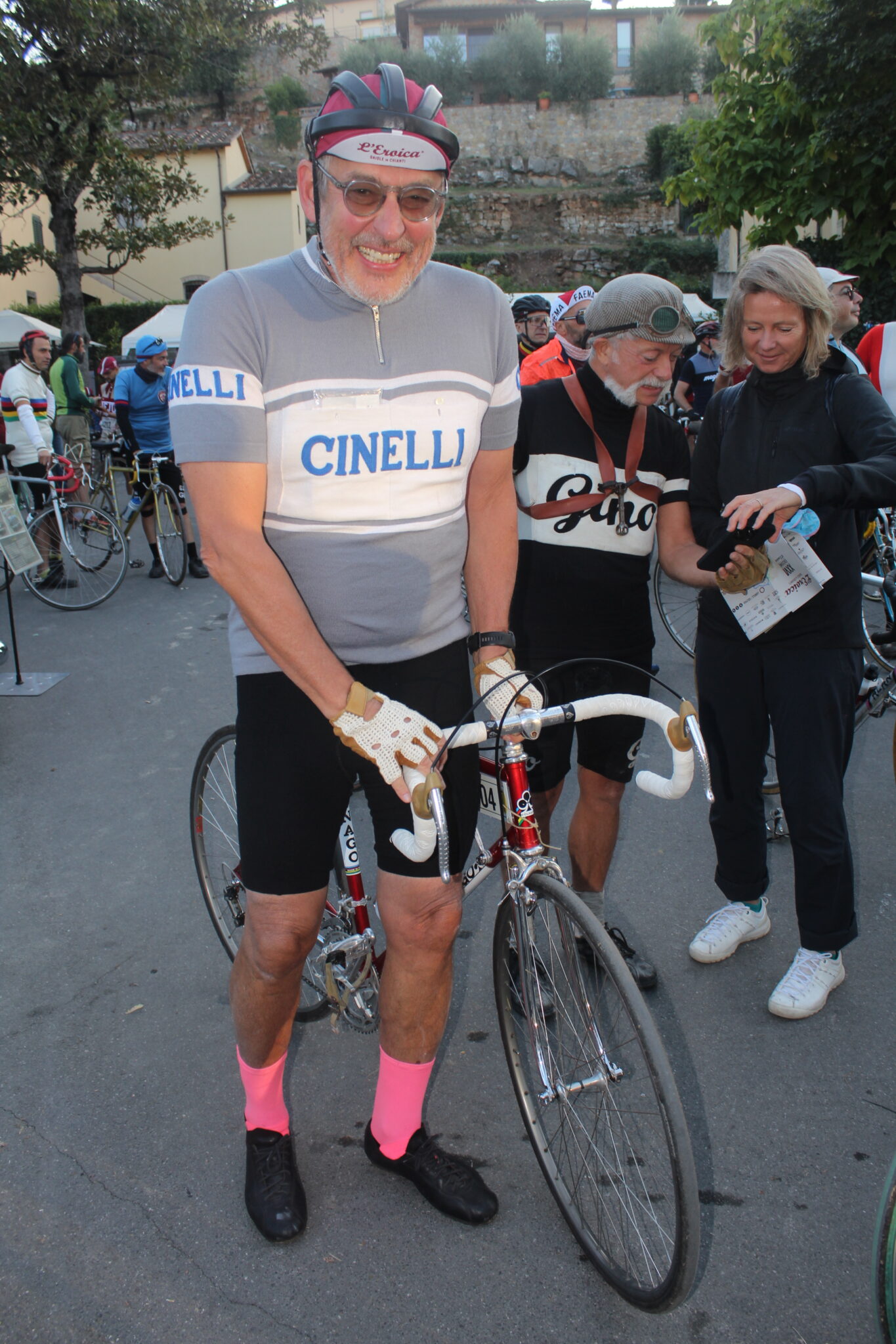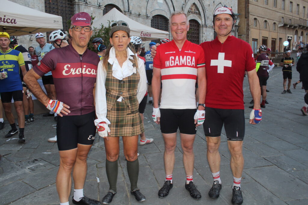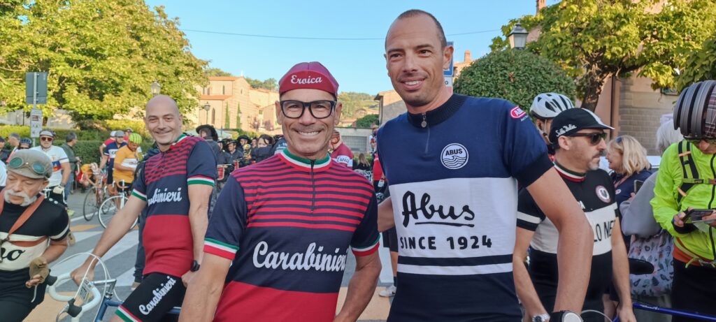 Il primo giorno procede con l’inaugurazione di Casa Eroica, a cui sono intervenute autorità politiche locali, tra cui il Presidente della Toscana Eugenio Giani, il Sindaco Michele Pescini e l’ideatore Giancarlo Brocci. Passeggiando poi per le vie si incontrano tanti amici, a partire da Silvia e Furio, che erano venuti all’Inbici Trainingcamp in Spagna e sono arrivati a Gaiole in bicicletta venerdì mattina direttamente da Firenze. Il negozio ufficiale di L’Eroica è colmo di appassionati e curiosi che acquistano gadget, libri ed abbigliamento prodotto dal maglificio Santini. All’esterno, nei bar ed ai vari stand è possibile bere in compagnia o partecipare a dei giochi dove si possono ricevere alcuni regali. E non mancano le bancarelle dedicate allo shopping, mentre si osserva la gente che ritira il ricchissimo pacco gara nella sua classica scatola di latta. Allo stand di Colnago Mary Cressari, ex primatista dell’ora e pioniera del ciclismo femminile, si è confrontata con Anna Trevisi, ciclista del Team UAE – Adq sulle differenze tra il ciclismo di una volta e quello attuale, ormai completamente diverso.