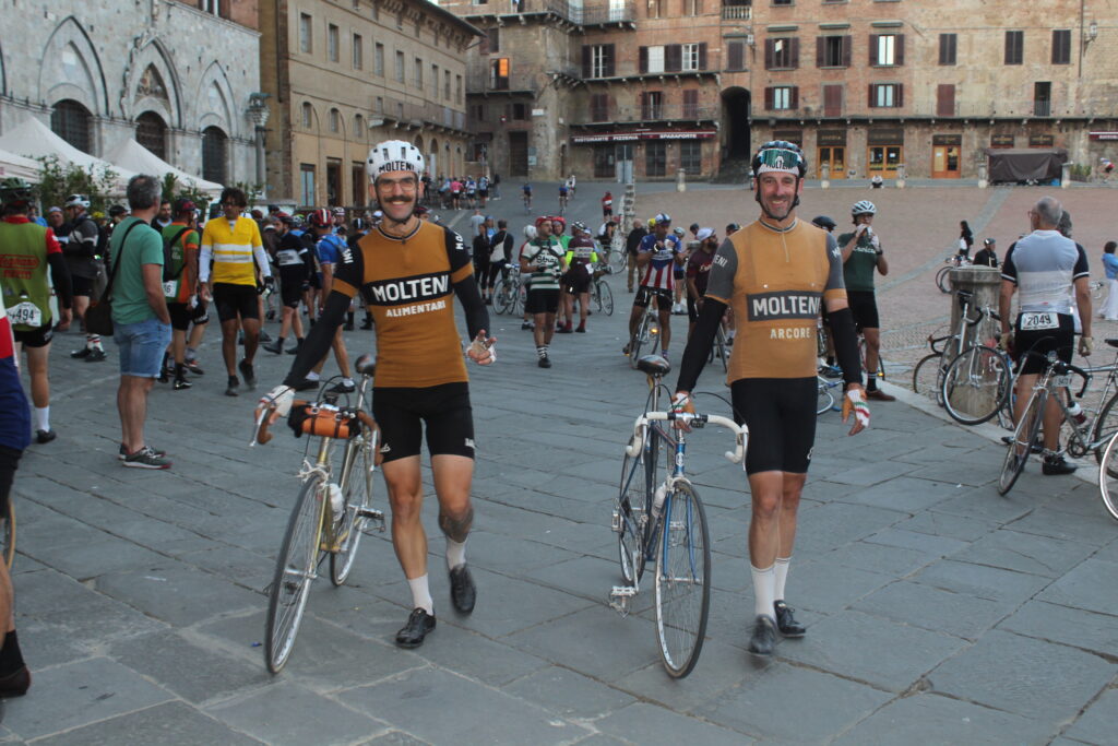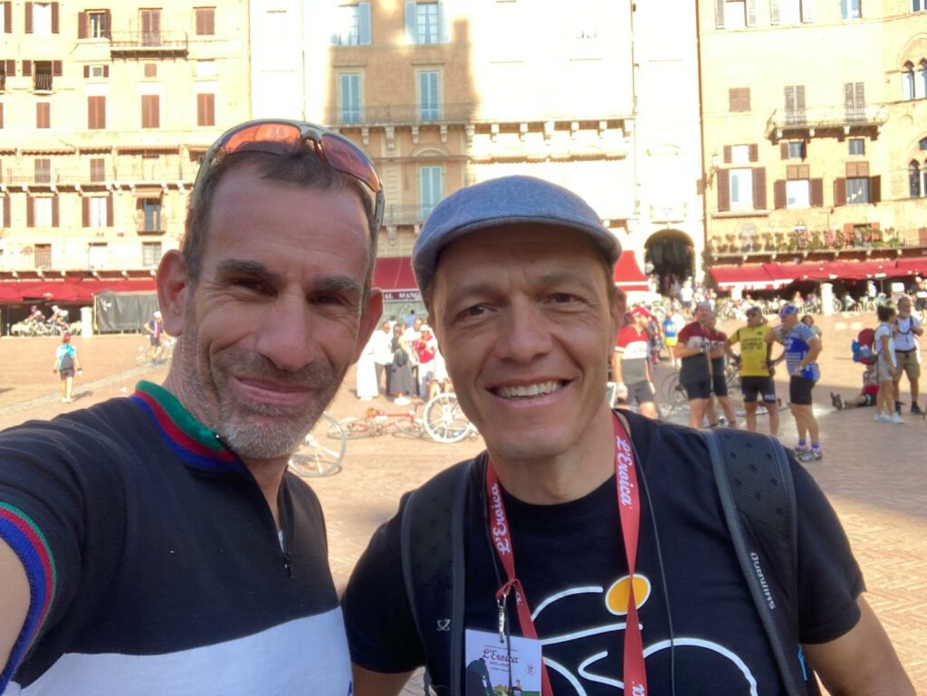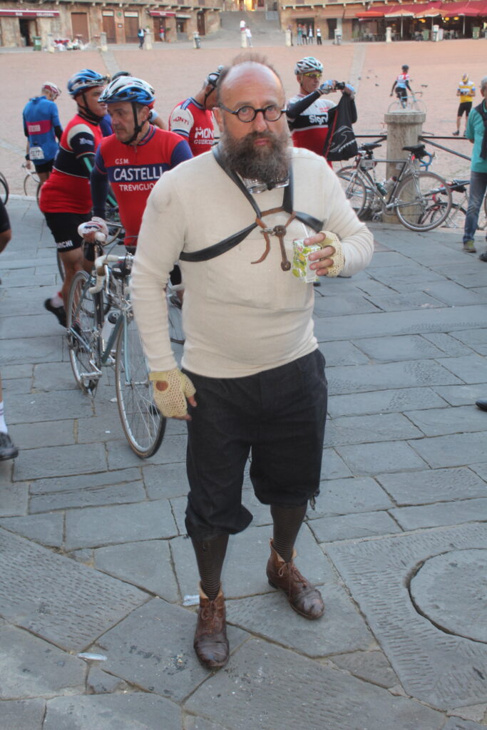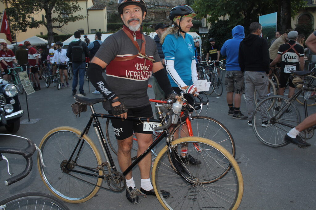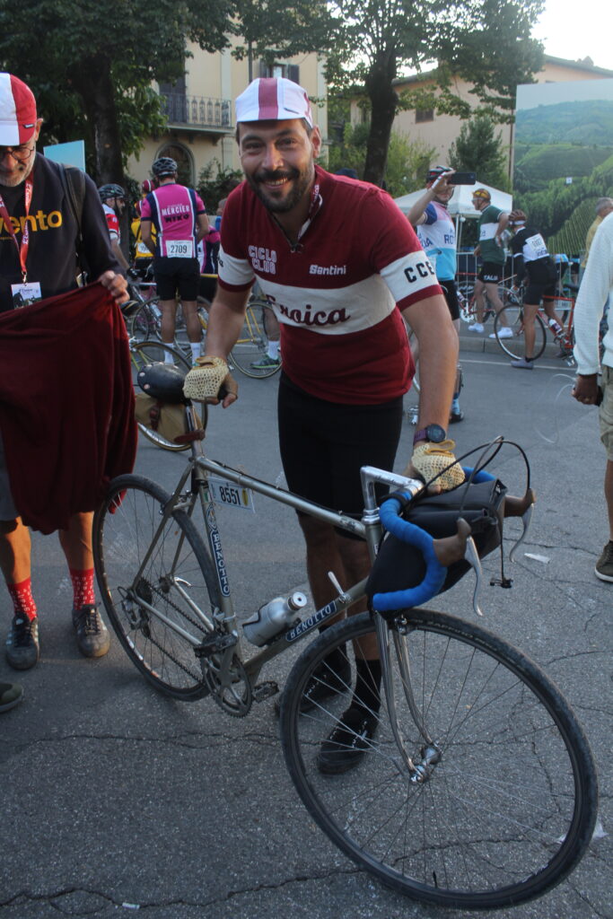 Alessandro prosegue: “Sono arrivato qui sabato sera dalla Sicilia ed è stata una grandissima esperienza. Grazie al Tour Operator che mi ha permesso di essere qui a vivere qualcosa di magico su ogni punto del percorso. La fatica è stata tanta ma mi aspettavo di peggio, a essere sincero, anche se non è stato facile abituarmi a guidare una bicicletta d’epoca. La cosa più bella è aver trovato sempre qualcuno che mi ha assistito quando ho bucato e quando sono scivolato, ci sono tanti partecipanti che sono stati gentilissimi e ho avuto modo di condividere qualche pedalata insieme. A Siena abbiamo trovato anche tanti turisti che quasi facevano a gara per fotografarci, pazzesco! E non mi aspettavo tutta quella folla ad applaudirci all’arrivo. Quest’anno ho fatto i 106 km ma il mio obiettivo è quello di farne 135 il prossimo anno e di prepararmi fisicamente nel modo migliore”.