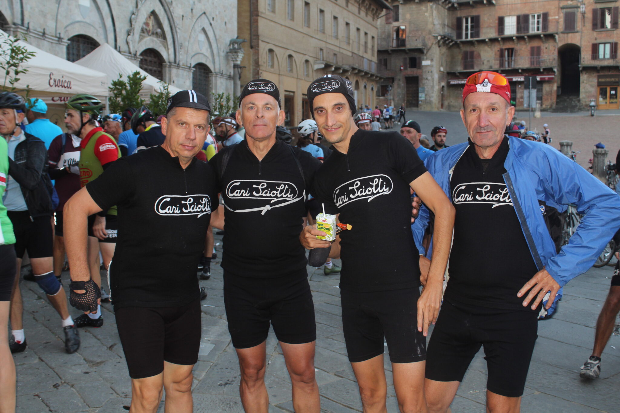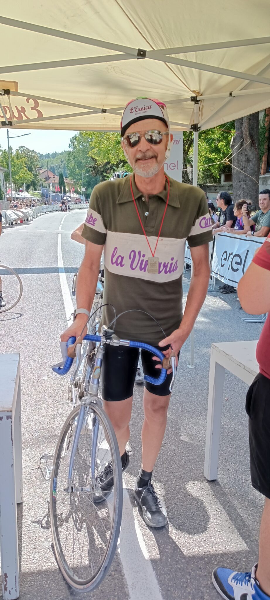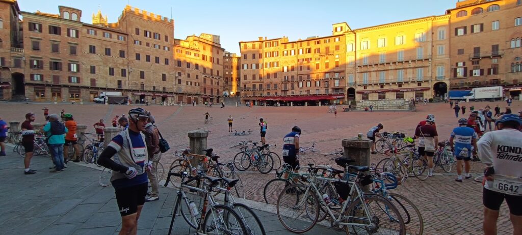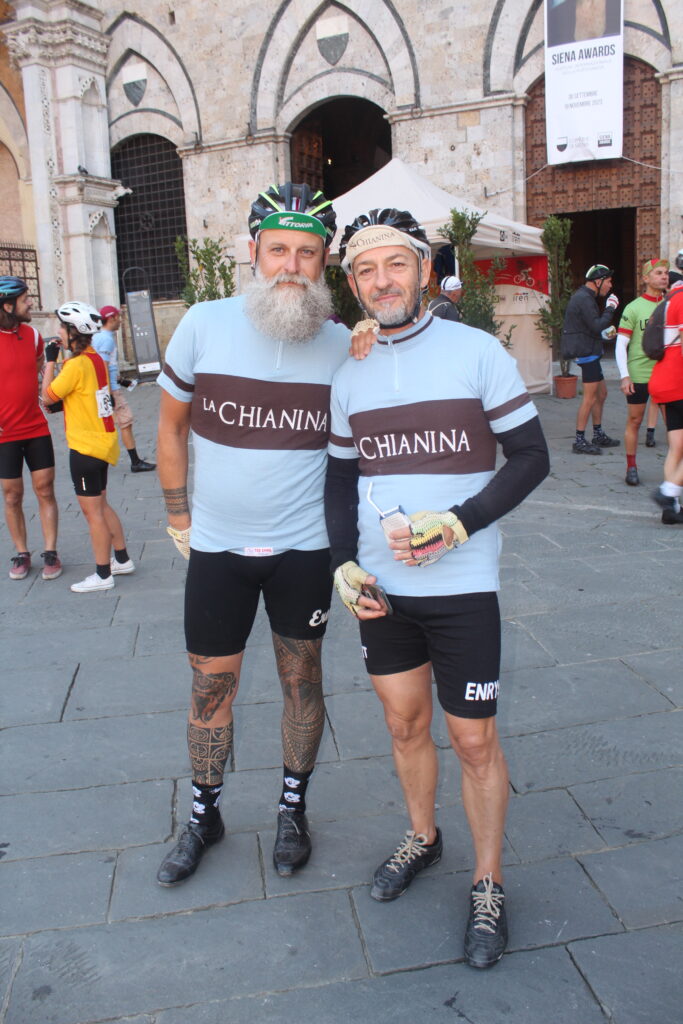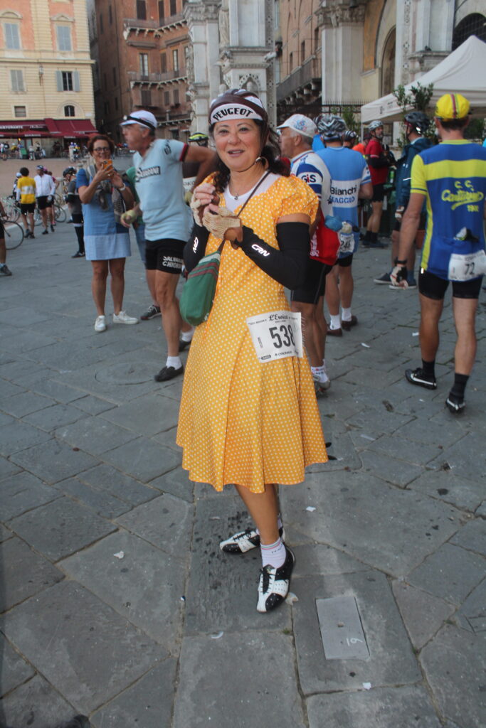 Alessandro prosegue: “Sono arrivato qui sabato sera dalla Sicilia ed è stata una grandissima esperienza. Grazie al Tour Operator che mi ha permesso di essere qui a vivere qualcosa di magico su ogni punto del percorso. La fatica è stata tanta ma mi aspettavo di peggio, a essere sincero, anche se non è stato facile abituarmi a guidare una bicicletta d’epoca. La cosa più bella è aver trovato sempre qualcuno che mi ha assistito quando ho bucato e quando sono scivolato, ci sono tanti partecipanti che sono stati gentilissimi e ho avuto modo di condividere qualche pedalata insieme. A Siena abbiamo trovato anche tanti turisti che quasi facevano a gara per fotografarci, pazzesco! E non mi aspettavo tutta quella folla ad applaudirci all’arrivo. Quest’anno ho fatto i 106 km ma il mio obiettivo è quello di farne 135 il prossimo anno e di prepararmi fisicamente nel modo migliore”.