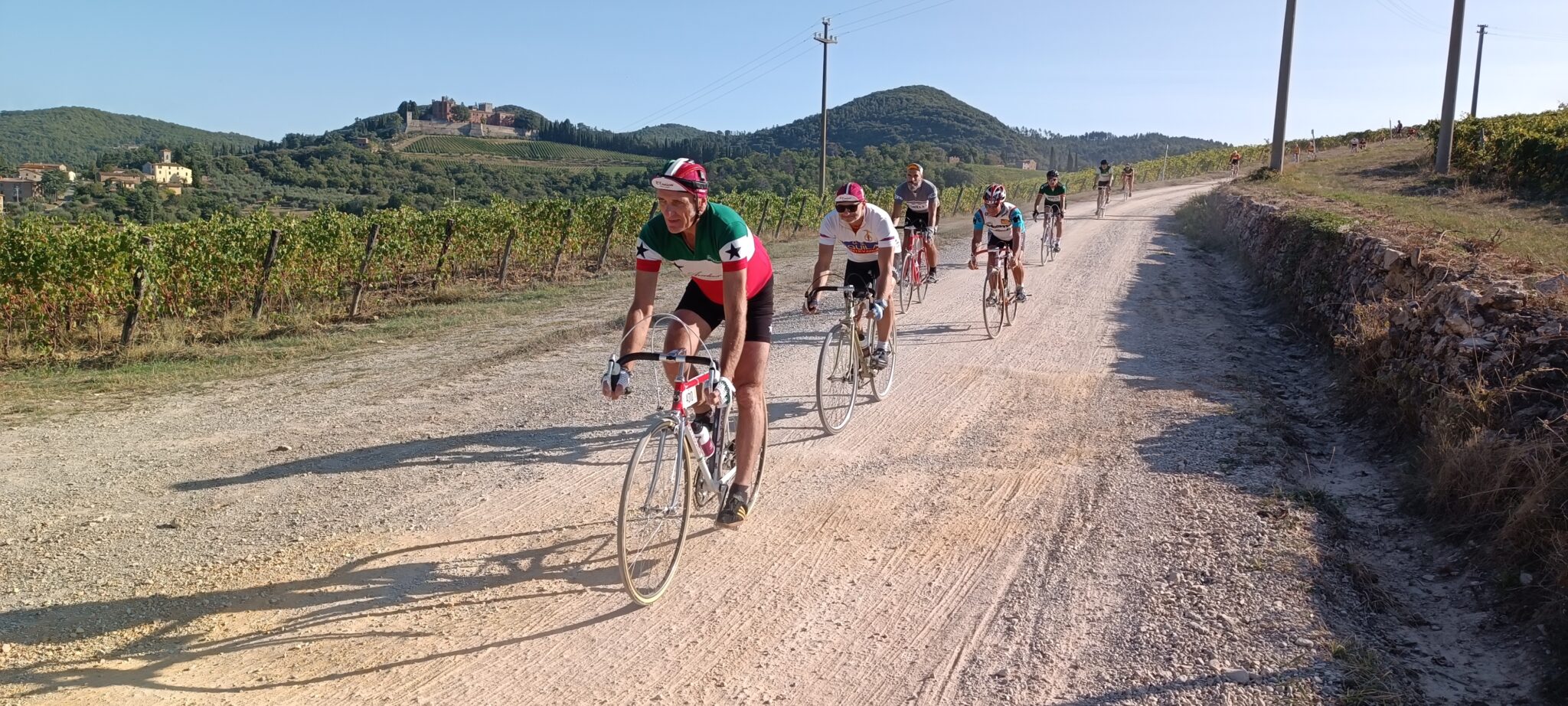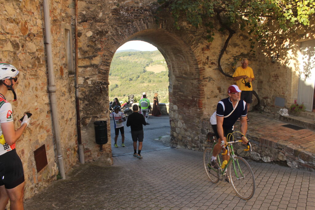 All’area ristoro in centro paese c’è Alessandro Vanotti, ex professionista al Team Astana e gregario di Vincenzo Nibali: è la sua prima partecipazione all’Eroica di Gaiole, ma con gli Amatori Verrazzano ha pedalato alla edizione di Montalcino: “Che grande gioia essere qua, è un evento unico al mondo. Nonostante la sveglia alle quattro ci siamo messi in griglia e siamo partiti alle 5 per fare questi 209 chilometri e mi sono emozionato molto quando è spuntata l’alba. Sembra di essere tornati indietro agli anni ’60, nonostante io abbia gareggiato alla Strade Bianche, che ha un fascino altrettanto particolare. E’ stato bellissimo incontrare tantissimi stranieri e tutti quelli che mi hanno riconosciuto e salutato. Ho appena mangiato una ribollita buonissima e mi attende il Monte Sante Marie, magari mi da una bella carica per la parte finale!“.