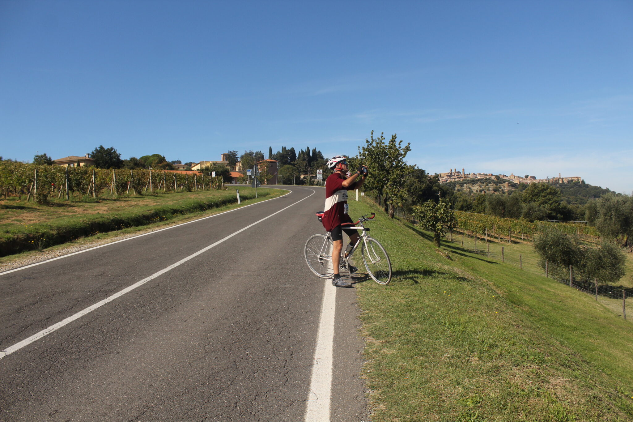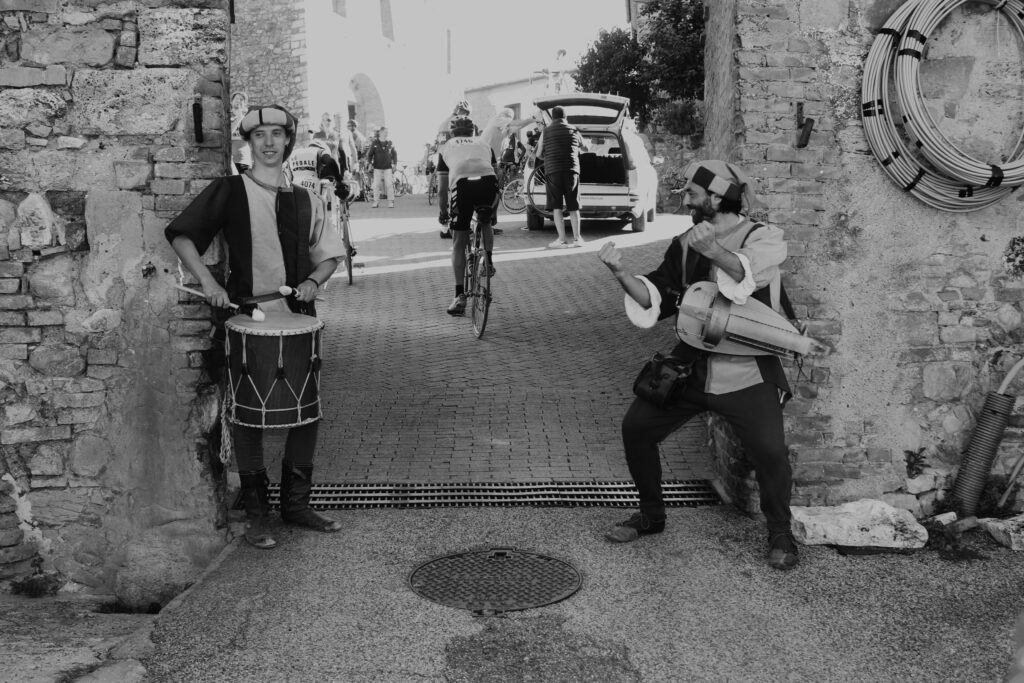 In questa ultima località siamo accolti da personaggi in costume storico locale: “Buongiorno, benvenuti a Murlo!” sarà la frase di benvenuto che sentiremo nei minuti seguenti. All’interno del castello è stata allestita la seconda postazione di ristoro ed una piccola zona con i meccanici per la riparazione di bici. Ma non solo: potevano mancare personaggi in costume rinascimentale a raccontare i classici stornelli in vernacolo senese rigorosamente in rima? Assolutamente no! Ma dopo un bicchiere di vino novello, un cantuccio ed una fetta di crostata tocca ripartire e proseguire l’avventura. Ci sarebbe da tagliare per Buonconvento, ma la strada provinciale è chiusa e siamo obbligati a passare per Montalcino, la patria del Brunello e dove è organizzata un’altra Eroica, a fine maggio. Da Murlo ci si reca attraverso il settore di Castiglione del Bosco, già affrontato al Giro d’Italia: raggiunto il centro abitato di Montalcino si va giù verso la Val d’Orcia e a sinistra per Buonconvento. Qui ci si trova a circa metà del mitico percorso lungo di “L’Eroica”, e c’è da fare ancora tanta fatica in bicicletta.