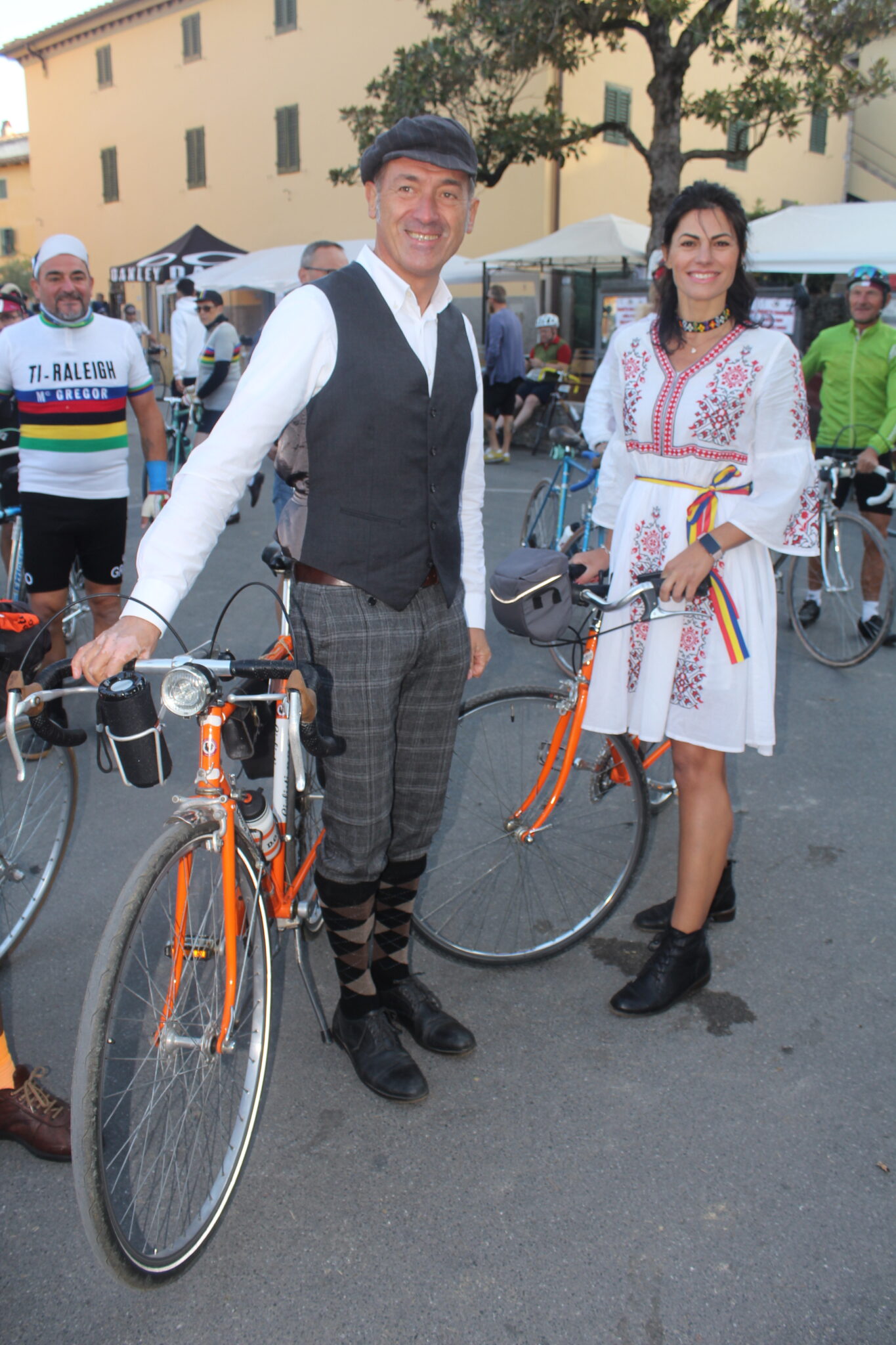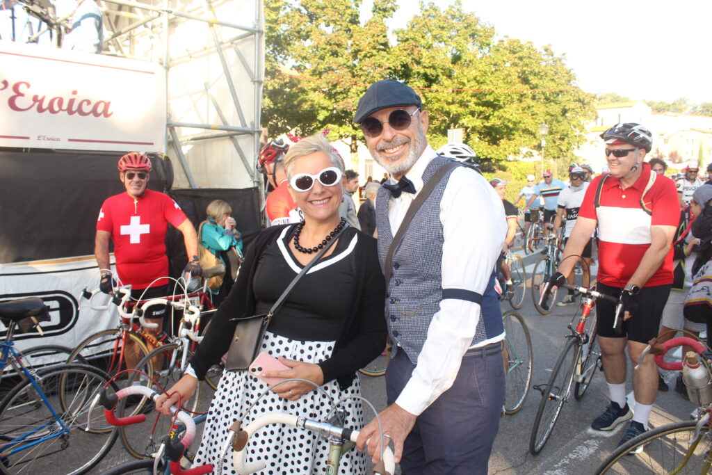 C’è anche una coppia italo-lussemburghese: Giada ha origini umbre e Dan è nel mondo del ciclismo grazie alla passione ed al lavoro di papà Roland. Per Giada questa è stata la prima volta a l’Eroica: “Mio marito è stato qui nel 2015 e nel 2017, è una corsa che gli è restata nel cuore. Avrei dovuto parteciparvi anche io qualche anno fa con lui ed altri amici lussemburghesi ma la gravidanza non me lo aveva concesso, così ho atteso questa sfida fino a oggi. Che percorso ho scelto? Quello di 81 chilometri, ci sono paesaggi mozzafiato, discese impegnative in cui è facile scivolare ma l’atmosfera è goliardica e trovi sempre qualcuno che si ferma a soccorrerti. Gli ultimi nove chilometri sembrano non finire mai, ma la gioia che provi quando tagli il traguardo non si può descrivere e ripaga gli sforzi e la fatica fatta. Chissà, magari nei prossimi anni ci tornerò!”.