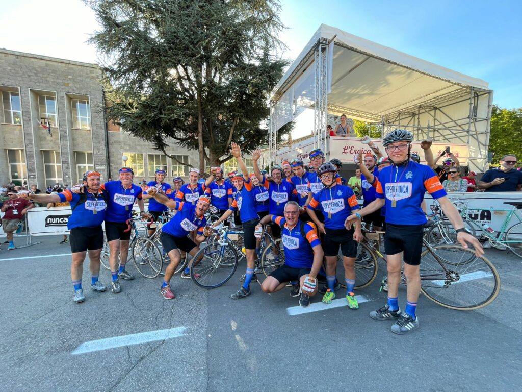 Con la squadra di Bicisport, il suo negozio nel cuore di Firenze, Stefano è un veterano dell’Eroica: “Quando nacque l’Eroica io organizzavo con BiciSport il Giro della Toscana, mentre Giancarlo Brocci si occupava della Chianti Classic, una manifestazione cicloturistica che partiva proprio da Gaiole. A lui venne l’idea di regalare l’iscrizione a questa “nuova” avventura sulle Strade Bianche, e partirono in 92. La fortuna fu che, non essendoci all’epoca eventi di questo genere, è riuscita a crescere negli anni diventando un prodotto internazionale a cui partecipano persone di varie nazionalità di tutto il mondo. Ogni anno c’è il sold-out delle iscrizioni, in controtendenza rispetto alle Granfondo, che in molti casi vivono attualmente una fase in calando. L’assenza della competizione, insieme alla magia dei paesaggi, della scenografia, dell’eno-gastronomia e dello stare insieme sulla bicicletta lascia un ricordo indelebile e felice a chi la vive. In ventisei edizioni si è arrivati a raggiungere il numero di novemila iscritti, che difficilmente trovi altrove: sono dati che aiutano a trovare sponsor di altissimo livello, come Colnago, Campagnolo, Elite, Vittoria ed Enel, insieme ai produttori e commercianti di bici ed abbigliamento che portano qui il materiale “vintage” acquistabile da appassionati e collezionisti. L’Eroica, quella vera, è a Gaiole in Chianti”.