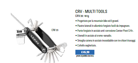 Tra i prodotti di precisione più interessanti ricordiamo il CRV – coltellino Multi Tools dal peso di appena 161g. Progettato per la mountain bike ed il grave, è dotato di piastre laterali in alluminio forgiato facili da impugnare e da punte forgiate in acciaio anti-corrosione Center-Pivot CrV. Assemblato con utensili in acciaio al cromo-vanadio, ha una smaglia catena in acciaio inossidabile con tre chiavi tiraraggi ed un coltello seghettato.