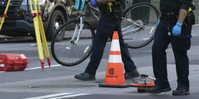 Police remove the bicycle of a female cyclist who was killed in a collision with a bus, Tuesday, June 16, 2020, along New York's Fifth Avenue adjacent to Central Park. (AP Photo/Mark Lennihan)