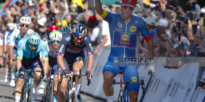 Jonathan Milan ha vinto la prima tappa del Giro di Germania, una frazione di 176 km da Schweinfurt a Heilbronn che proponeva lo strappo di Jagerhaus (1500 metri al 7,8% di pendenza media) quando mancavano una dozzina di chilometri al traguardo. Il velocista della Lidl-Trek ha dominato in maniera perentoria la volata a ranghi compatti, surclassando l’intera concorrenza e tagliando la linea d’arrivo a braccia aperte, segno di un trionfo incontrastato. Il 23enne friulano ha preceduto con margine il belga Jordi Meeus (Red Bull-Bora-Hansgrohe), il tedesco Max Kanter (Astana Qazaqstan) e il norvegese Alexander Kristoff (Uno-X Mobility).