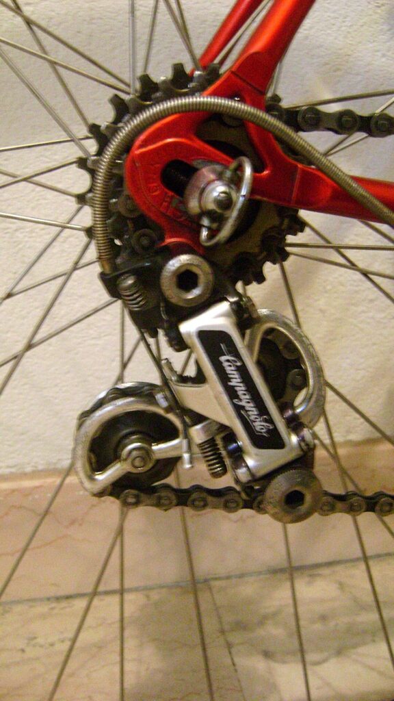 La bici Colnago presentata è montata con un gruppo Campagnolo Super Record (nato nel 1979) e caratterizzato dal cambio posteriore con blocchetti neri e dalla belletta liscia con la scritta Campagnolo con sfondo nero. Anche il deragliatore anteriore presenta le bellette anodizzate in nero e il corpo caratterizzato da tre fori ovali per alleggerire il deragliatore stesso.