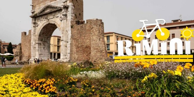 Rimini per l’arrivo del Tour de France si è vestita di giallo: la grande scritta che campeggia al porto (36 metri per 8), la struttura tridimensionale dedicata al Tour in piazzale Fellini e davanti alla porta storica di ingresso della città circondata da decine di fiori gialli all’arco d’Augusto, il totem con il countdown in piazza Cavour e nella zona dell’arrivo. Tutte le strade interessate dalla corsa sono state asfaltate nei tratti di tracciato bisognosi di manutenzione e nei prossimi giorni arriveranno altre due grandi sorprese.