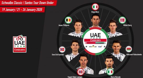 La stagione 2020 dell’UAE Team Emirates inizierà con il Tour Down Under, corsa australiana di categoria World Tour in programma dal 21 al 26 gennaio.