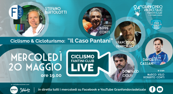 In attesa di poter vivere la 24ma Gf Via del Sale Fantini Club, il prossimo 11 ottobre a Cervia, e la seconda edizione della Strade Bianche del Sale Fantini Club, domenica 6 settembre a Cervia, la rubrica di incontri Via del Sale Live dedicati al mondo del Ciclismo e Cicloturismo prosegue ogni mercoledì in diretta sulla pagina Facebook @granfondoviadelsale, sul canale YouTube Granfondo Via del Sale e sul sito granfondoviadelsale.com.