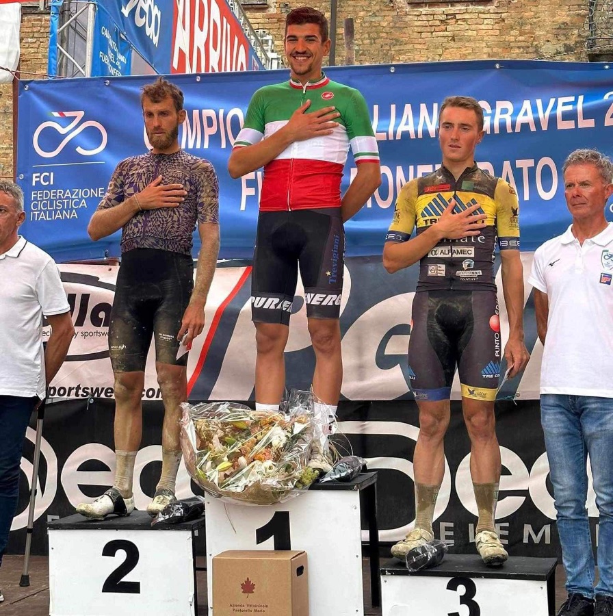 Matteo Zurlo (Uc Trevigiani Energiapura Marchiol) è campione italiano delle specialità gravel. La gara si è svolta in Piemonte a Fubine Monferatto, in provincia di Alessandria. Con lui c’erano i compagni di squadra Edoardo Laino e Ignazio Cireddu, assistiti dal direttore sportivo Leonardo Sari. I corridori compiono il primo giro in gruppo. Nel corso del secondo giro Matteo Zurlo rompe gli indugi, portandosi dietro un altro atleta. Nel terzo giro si forma un drappello di sette uomini. Sul tratto dello sterrato Matteo prende il volo. Gli altri lo vedono solo dopo l’arrivo.