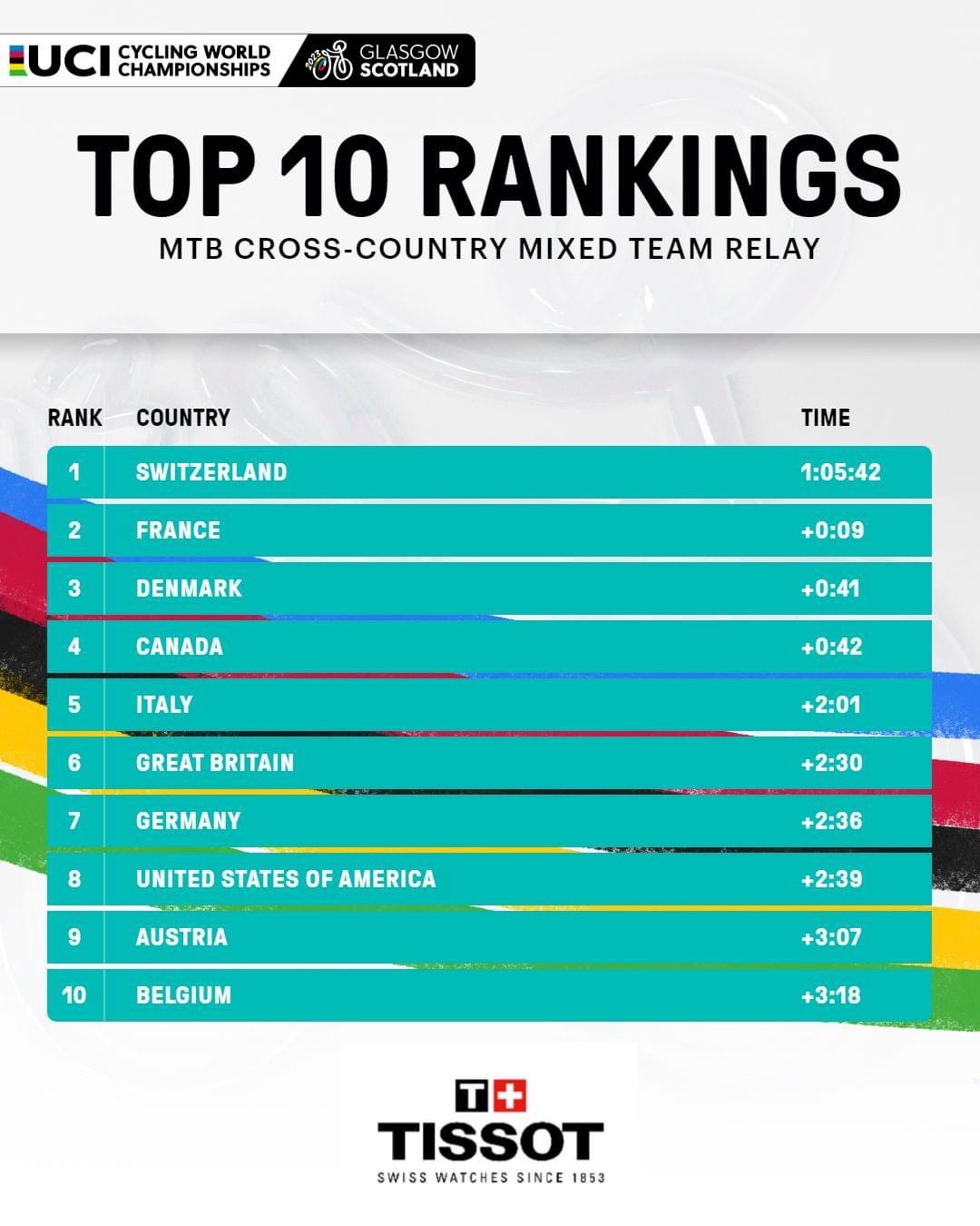 Nell’ultima tornata il dieci volte Campione del Mondo Schurter non deve fare altro che gestire per mantenere il vantaggio su Sarrou e completare l’opera. Argento alla Francia e bronzo a una straordinaria Danimarca. Non riesce l’impresa da podio al Canada, mentre un ottimo Luca Braidot porta l’Italia alla quinta posizione finale, con un distacco di 2’01” dalla testa e di 1’20” dal podio.