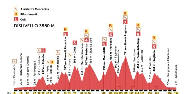 La nuova veste del percorso cosiddetto “lungo” prevede un totale di 194 km con un dislivello di 3880 metri. Buona parte della strada che percorreranno i partecipanti sarà quella tradizionale ma sul finale di gara assisteremo a numerose novità. La prima è dopo la salita del Barbotto con la “nuova” discesa alle Ville di Montetiffi che porterà gli atleti al cospetto di un gruppo di case immerse nel verde, da dove si può scorgere in lontananza l’Abbazia Benedettina allo scollinamento della rampa di Montetiffi per poi raggiungere Perticara. La novità più sostanziale arriva però all’ultimo colle che non sarà più il Gorolo, sostituito dalla salita di Sogliano e della conseguente discesa della Cioca: 4 chilometri di salita con pendenza media attorno al 5% poi giù per la Cioca con 18 tornanti in una delle discese più belle della Romagna. Anche il finale vedrà modifiche sostanziali verso Cesenatico in vista del traguardo. La carovana dei corridori scenderà a valle in direzione Fiumicino seguendo lo storico fiume fino alle porte di Cesenatico.