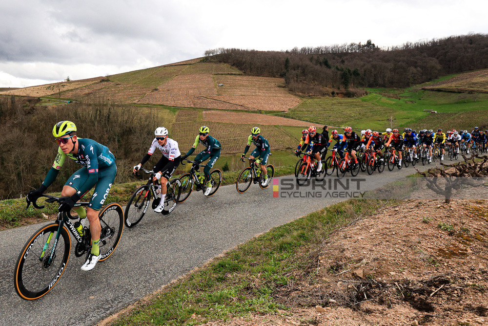 Con il gruppo compatto c’è stata subito battaglia allo sprint intermedio di Régnié-Durette con Remco Evenepoel che ha battuto Primoz Roglic, prendendosi i sei secondi d’abbuono. Sulla salita del Col du Fût d’Avenas-Les Chappes attacca Plapp, che poi viene raggiunto da Buitrago. I due tengono un vantaggio tra i quindici e i venti secondi, mentre tra i big perde contatto David Gaudu, capitano della Groupama – FDJ, vittima di una caduta.