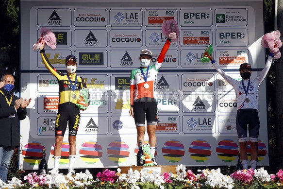 All’ultimo passaggio da Cittiglio la ossolana ha 25” di vantaggio, che aumentano con il passare dei chilometri. Ad Orino, in cima all’ultima salita, il distacco raggiunge il minuto e dietro Longo Borghini, il vuoto: le inseguitrici non collaborano con Marianne Vos, che sarebbe stata la favoritissima in caso di ricongiungimento e sprint. Elisa gestisce il gap in modo perfetto, e può esultare in largo anticipo a Cittiglio sotti gli occhi del Presidente F.C.I. Cordiano Dagnoni, del Team Manager della Trek-Segafredo Luca Guercilena e del C.T. Edoardo Salvoldi. Marianne Vos vince la volata e scende di un gradino del podio, terza è Cecilie Uttrup Ludwig: la danese ha concluso per la terza volta in carriera il Trofeo Binda in questa posizione d’arrivo. Per quanto riguarda le altre italiane Soraya Paladin è quinta, mentre Elisa Balsamo vince la volata del gruppone battendo Sofia Bertizzolo. Chiude la Top 10 l’olandese Floortje Mackaij.