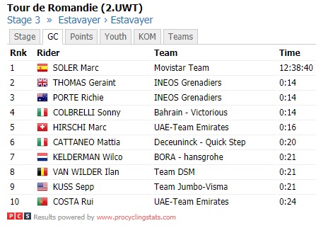 Marc Soler è il nuovo leader della classifica generale: lo spagnolo ha 14” su Geraint Thomas, Marc Soler e lo stesso Colbrelli, con Mattia Cattaneo a 20”. Domani si corre la frazione regina, da Sion a Thyon 2000, con quattro GPM e 4000 metri di dislivello. E’ prevista neve sull’arrivo e la organizzazione ha anticipato la partenza di due ore: il nuovo orario è stato fissato alle 10:35, con arrivo intorno alle 15.