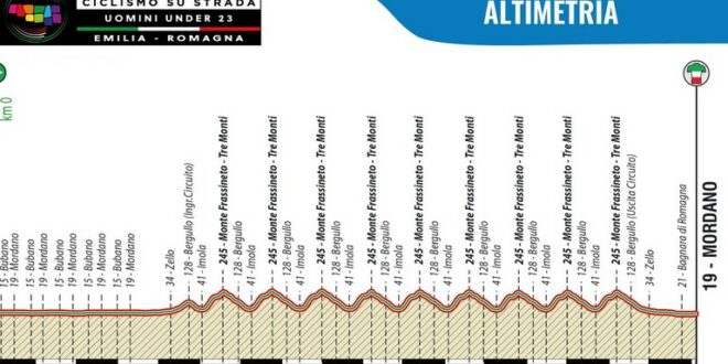 La salita misura circa 4 km, con pendenza media del 4% e due punte che toccano il 12% di pendenza massima; un’asperità abbordabile, con i suoi 250 metri di dislivello, ma che ripetuta per nove volte si farà sentire nelle gambe degli atleti. L’ultimo passaggio in cima (Monte Frassineto – Tre Monti) è a 20 km dall’arrivo di Mordano.