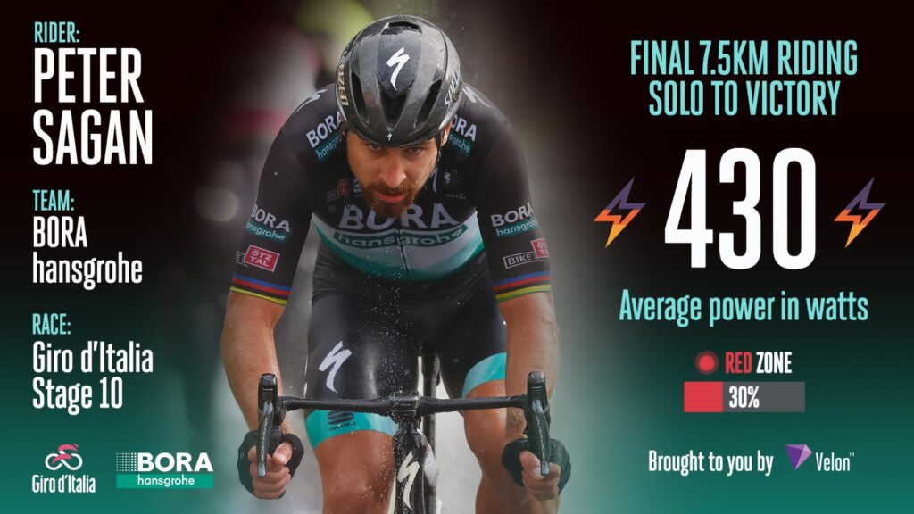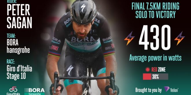 Velon ha reso noti i dati di Peter Sagan al termine della tappa da lui vinta a Tortoreto Lido. Secondo quanto riportato, lo slovacco sarebbe stato in grado di spingere 430 watt sui pedali negli ultimi,i 7,5 km di gara.