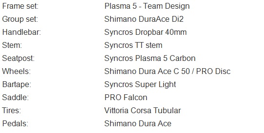Plasma 5 – Team Edition Per le prove a cronometro, il Team DSM utilizzerà la SCOTT Plasma 5. La bici ha più campionati del mondo ITT e infiniti titoli Ironman e continua a dettar legge quando si tratta di combattere contro il tempo. Ogni tubo della Plasma 5 è aerodinamico e combinato con la sua costruzione leggera rende questa bici un’arma efficace contro il vento. Gli ingegneri Syncros si sono concentrati sulla creazione di un sistema completo di barre di base, estensioni e posizionamento della sella per consentire un’ampia gamma di regolazioni per dare a ogni rider la possibilità di trovare la propria posizione ottimale.