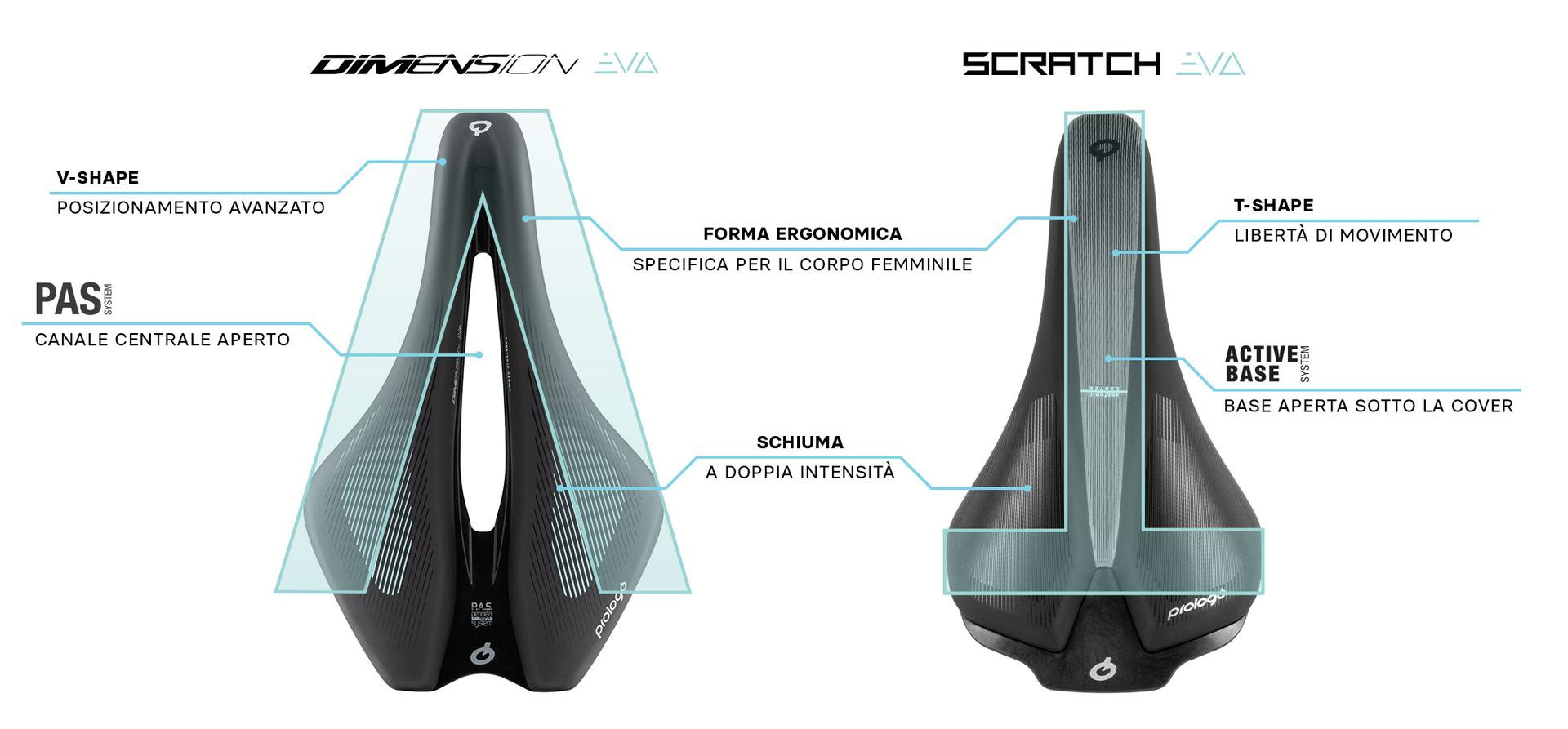 Il canale centrale PAS è stato ampliato del 18%, riducendo la pressione sui genitali femminili. Anche la punta della sella è stata progettata per essere più larga del 13%, aumentando il comfort nelle posizioni di pedalata più avanzate. La grafica elegante, con linee sottili e dettagli azzurri, rende la Dimension EVA riconoscibile e stilosa.