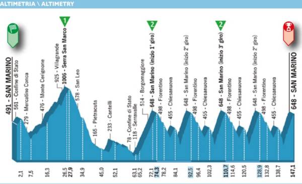 Tappa breve ma molto dura. 147,1 km con partenza ed arrivo nella Repubblica di San Marino, con 3 GPM disseminati sul percorso oltre ad altre tre salite impegnative che non sono classificate come GPM. Dopo un breve tratto di discesa nei primi km, i corridori si troveranno subito sull’ascesa verso Serra San Marco che, con i suoi 1006 m di altitudine, sarà il punto più alto della settimana. Salita lunga ma non particolarmente impegnativa (12 km al 4,3%) che farà da antipasto al duro circuito di 18,2 km che sarà percorso quattro volte. Due le salite nel circuito, lo strappo breve verso Chiesanuova e soprattutto l’ascesa verso San Marino che la prima volta sarà lunga 10 km, mentre le altre quattro volte misurerà 5,7 km con pendenza media del 7,5%. L’ultima di queste ascese porterà al traguardo di questa che possiamo certamente definire la “tappa regina” della corsa.