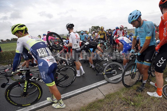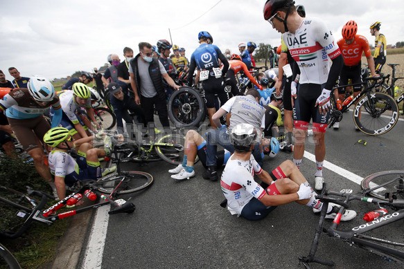 L’incidente è avvenuto a 3,3 km dal traguardo e ha visto finire a terra molti atleti, tra i quali alcuni ciclisti dell’UAE Team Emirates: per questi ultimi, nessuna conseguenza fisica di rilievo, con il solo Alessandro Covi medicato per alcune piccole abrasioni.