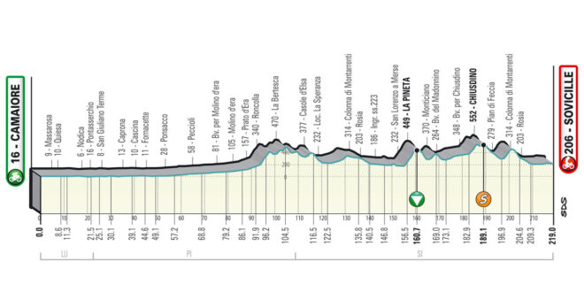 219 chilometri da Camaiore a Sovicille, per una frazione che dovrebbe essere dedicata alle ruote veloci. Usiamo il condizionale perché le uniche insidie a livello altimetrico sono poste proprio sul finale: nulla di particolarmente duro, ma un paio di strappi di qualche chilometro al 4/5% di pendenza media a circa 20 chilometri dall’arrivo possono indurre qualche squadra o qualche corridore a tentare il colpo grosso.